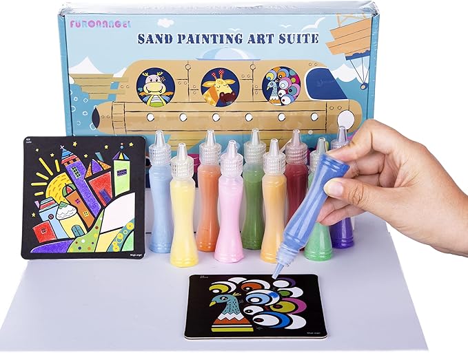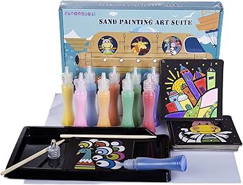 Çocuk Renkli Kum Resim Kiti Eğitsel Kendin Yap El Yapımı Kum Resim Seti Kum Sanatı Kitleri Eğitici Oyuncak Zehiri Çocuklar için Kendinden yapışkanlı karton çizim kartı kağıdı, 10 büyük şişe bol miktarda açık renk Dolomit kum Güvenli, çevre dostu, solmaz, kağıdın kalitesi, yapışkanlığı ve kesiklerin hassasiyeti çok oldu Küçük sanatçılarınız hayvanları, bitkileri, insanları, yiyeceklerden vb Alfabeleri yazmaya kadar hayal edebileceğinizden çok daha fazlasını elde edebilirler