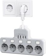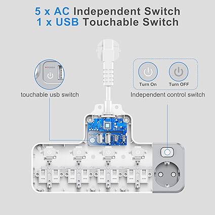 6 bağımsız anahtar: Beyaz ışıklı 5 anahtar, 5 AC prizine (16A/4000W) karşılık gelir. Yumuşak ışıklar gece uykunuzu rahatsız etmeyecektir; Enerjiden ve faturalardan tasarruf etmek için kullanılmayan prizleri kapatabilirsiniz.Uzatma kablosunun çıkışları 1,3 cm aralıklıdır. Not: Anahtar, USB’nin güç kısmını kontrol etmez.USB Dokunmatik Anahtarı: USB bağlantı noktalarını kapatmak veya açmak için USB alanının sol tarafındaki anahtara 1 saniye boyunca dokunun. Sıradan düğmelerin aksine dokunmatik anahtar daha hassastır ve kullanımı daha kolaydır.