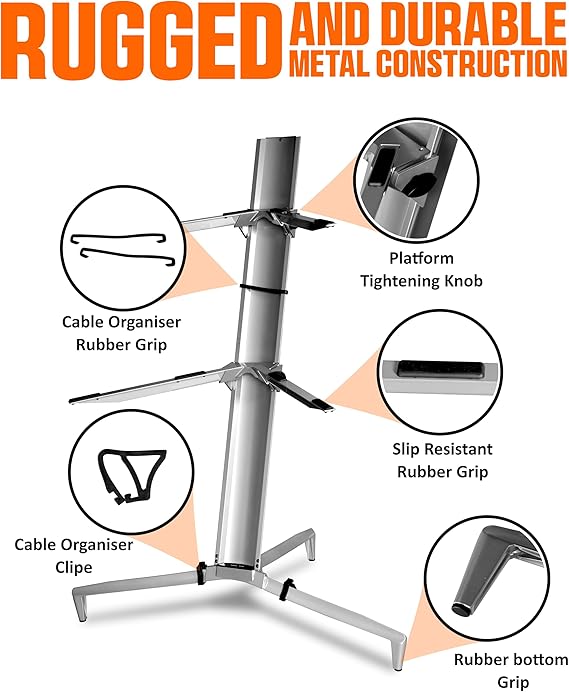 ✔️ Stabilite için Tri-Barlar: Stand, 13 inç ve 18 inç yükseklikteki üç çubuklara sahiptir. Bu tasarım sadece dengeyi arttırmakla kalmaz, aynı zamanda klavyeleriniz için her biri 125 lbs’ye (56,69 kg) kadar taşıyabilen bir platform sağlar. Aletleriniz performansınız sırasında güvenli ve sabit kalacaktır.