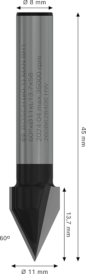 Professional Aksesuar 2608 628 406 V Oluk Freze 8 mm, D1 11 mm, Uzunluk 14 mm, G 45 mm, 60°
