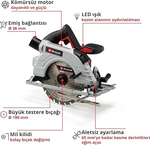 Einhell Akülü Daire Testere TP-CS 18/190 Li BL-Solo, Power X-Change ailesinin güçlü bir üyesidir Yüksek kaliteli karbür uçlu testere bıçağı, hassas ve temiz kesimler sağlar