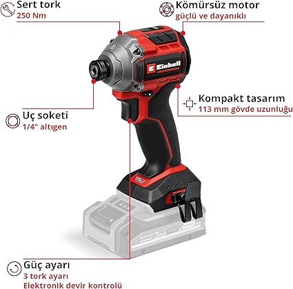 Akü dahil değildir – Einhell Professional Akülü Darbeli Somun Sıkma TP-CI 18/250-C Li BL-Solo Power X-Change akü ve şarj cihazı olmadan teslim edilir.
