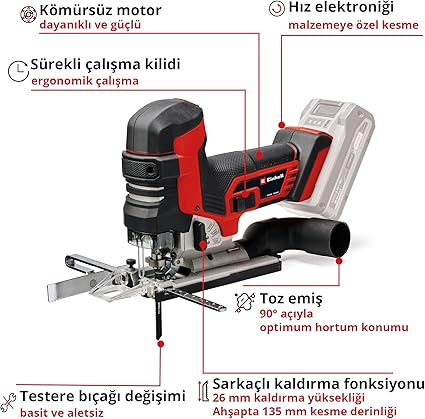 T stili – T stili tutamak, testerenin baş üstünde bile kolayca yönlendirilmesini sağlar. Değiştirilebilir sarkaç stroku, sürekli yüksek çalışma pürüzsüzlüğü ile hızlı ve hassas kesimler sağlar.