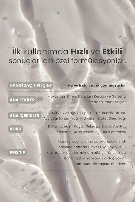 Saçları derinlemesine besleyerek onaran ve ısıya maruz kalmış kabaran saç tellerini canlandıran bağ onarıcı maskesi