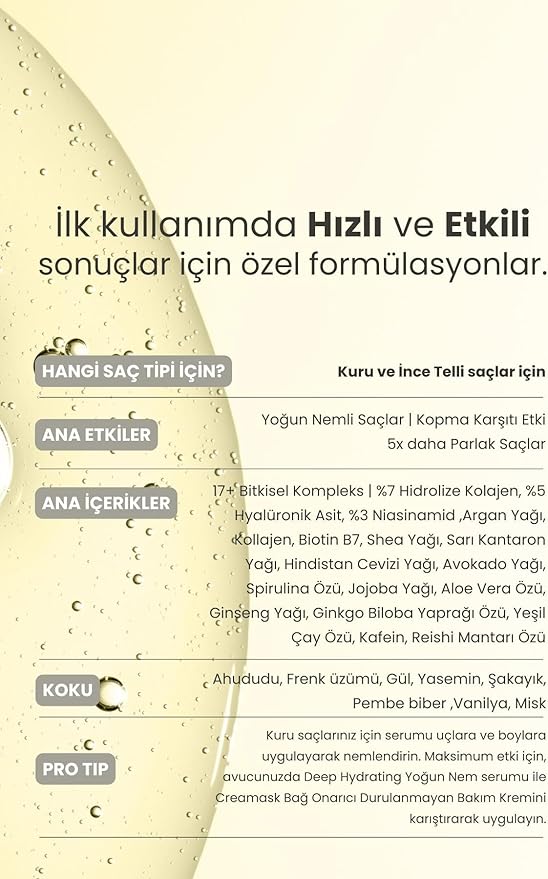 Saçların yumuşak, parlak ve sağlıklı görünümünü desteklemek ve kuruluktan kaynaklanan problemleri çözerek etkili bir yumuşaklık kazandırmak için son dokunuşu Deep Hydrating Serum ile sağlayın