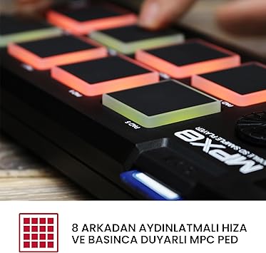 Parmakla Davul Çalma Temelleri: Davul seslerini, melodileri, bas çizgilerini ve daha fazlasını tetiklemek için ideal olan sekiz arkadan aydınlatmalı hız ve basınca duyarlı ped