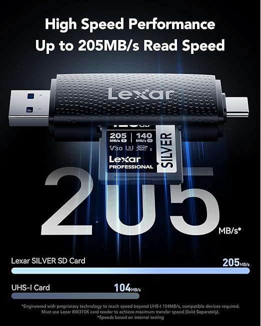 205MB/sn maksimum okuma hızı, Lexar RW310X kart okuyucu ile bekleme sürelerini hızlandırır, aktarır ve azaltır. Maksimum aktarım hızına ulaşmak için Lexar RW310X kart okuyucusunu kullanmalısınız. (Ayrı satılır). 140MB/sn maksimum yazma hızı, tek bir kareyi bile kaçırmadan seri fotoğraflar çekmenizi sağlar.