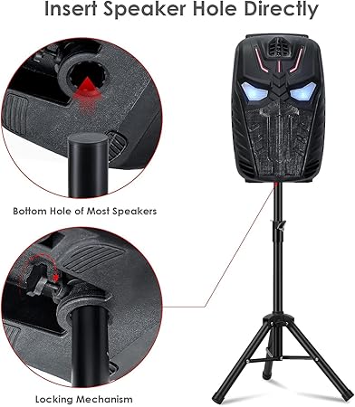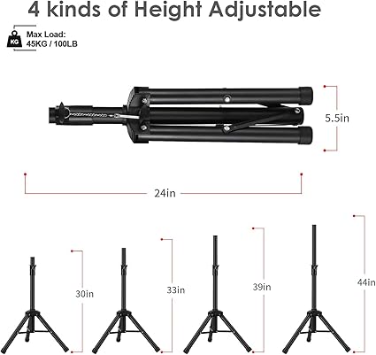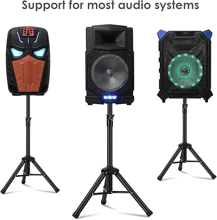 – Katlanabilir Tripod Stand, Kaymaz Kauçuk Tabanlar Taban, seçtiğiniz yüksekliğe bağlı olarak farklı genişliklere ayarlanabilir ve daha fazla denge sunar. Boyun kısmı, hoparlörü daha yükseğe yerleştirmek için ayarlanabilir. Kaymaz plastik ayaklar sayesinde stand sabit durur ve 45 kg veya daha ağır hoparlörleri rahatlıkla taşıyabilir.