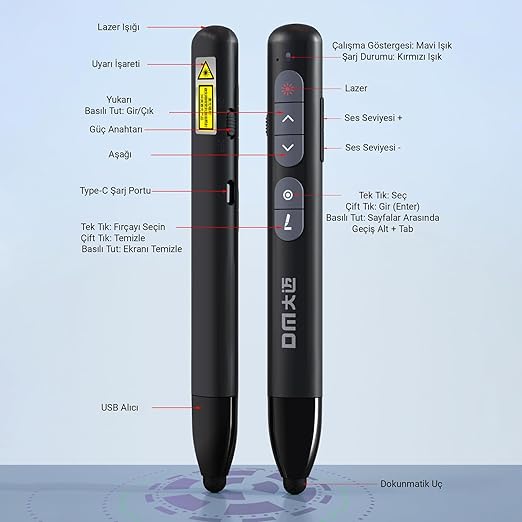Lazer USB alıcı muhafazasının içinde bulunmaktadır, lazeri kullanmak için USB alıcıyı çıkartmanız gerekmektedir. Sunumunuz bittiğinde USB alıcıyı tekrar kumanda içerisinde muhafaza edebilirsiniz. Kaliteli ABS malzemeden yapılmış olup, Type-C portu üzerinden şarj edilerek çalışır.