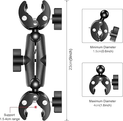 【Çift Yengeç Kelepçeleri】 1,5-4 cm sıkıştırma genişliğini destekleyen çift kelepçe tasarımı, süper kelepçe montajı gidonlara, traverslere, selfie çubuğuna vb. sabitlenebilir.