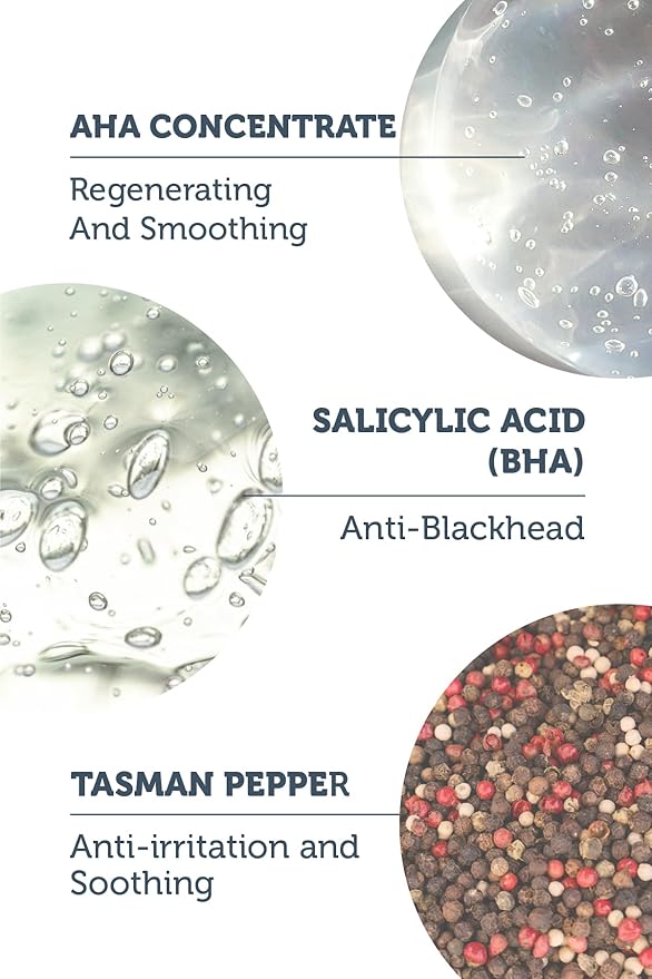 AHA Konsantresi: Çeşitli meyve asitlerinin birleşimidir; sitrik asit, laktik asit, malik asit, glukonik asit, glikolik asit ve tartarik asit, salisilik asit ve askorbik asit. Cilt yüzeyindeki ölü hücreleri temizleme özelliğine sahiptir. Nazik bir peeling etkisi vardır ve cildin yenilenmesine ve daha iyi bir görünüme kavuşmasına katkı sağlar. Düşük pH’ı nedeniyle hassas ciltlerin kullanımı için önerilmez.