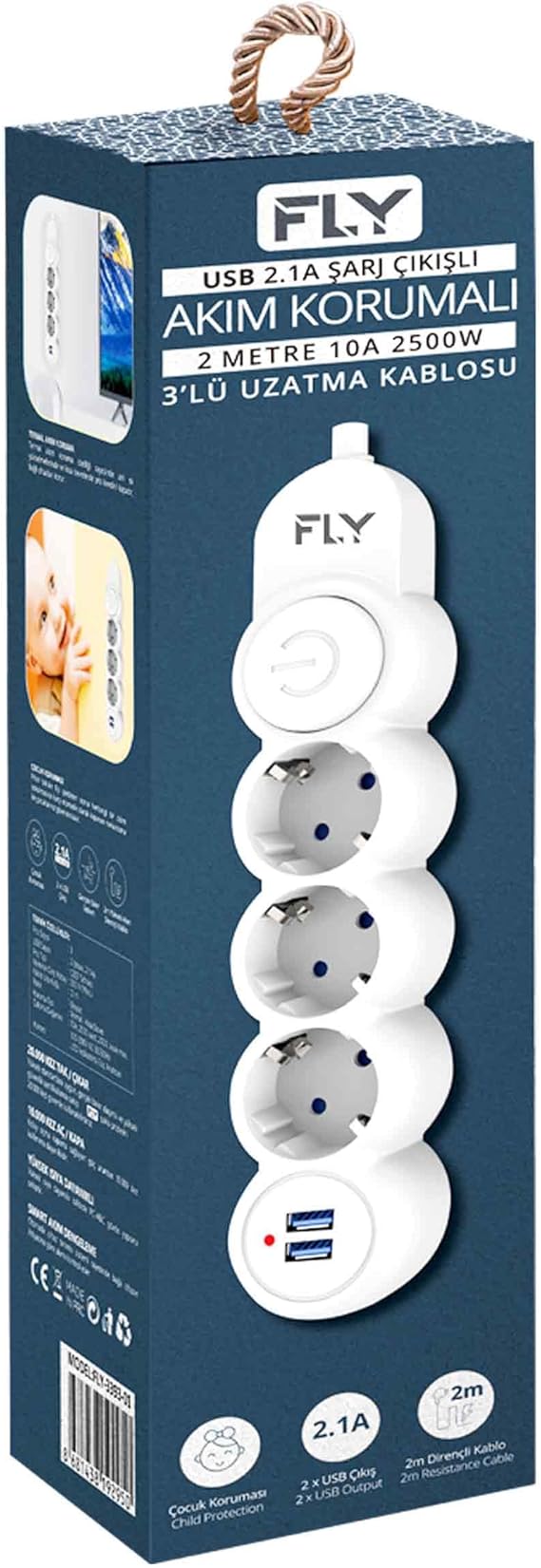 Racing FLY 3393 Termal Akım Korumalı, Çocuk Korumalı, 2 X USB, 2Mt Uzatma Kablosu 3’lü Priz, Beyaz