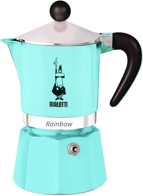 – Rainbow: 6 Cups Ocak Üstü Espresso Pişirici – 250ml – Açık Mavi Renk – Alüminyum Gövde – Patentli Güvenlik Valfi – Tüm Ocak Türleri İçin Uygundur (İndüksiyon Hariç)