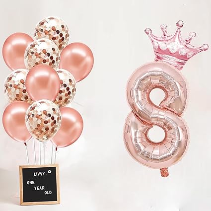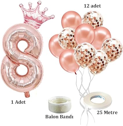 Rakam Folyo Balon, Kral Tacı, Konfetili Rose Gold Balon, Rafya ve Balon Bandı
