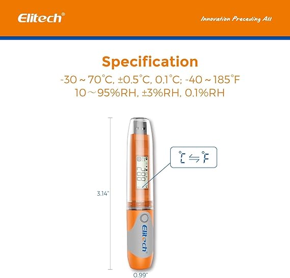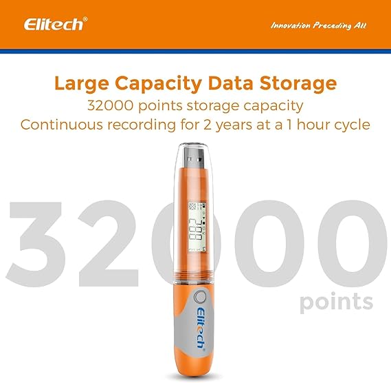 Tekrar kullanılabilir sıcaklık nem kaydedici. Geniş ölçüm aralığı -86°F~177°F(-30°C ~+70°C), %10RH~%95RH, 32.000 sıcaklık noktasına ve 32.000 nem noktasına kadar kaydeder.