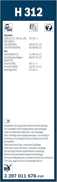 Rear Arka Silecek Hyundai i30 (2007-2011), Kia Sportage (2010-2015), Picanto (2011-2016) [300 mm] H312 3397011678