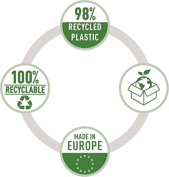Avrupa’da üretilmiştir, %98 geri dönüştürülmüş plastikten üretilmiştir, %100 geri dönüştürülebilir, CO2 dengelenmiş (izleme no. 11538-1910-1001), Blauen Engel sertifikalı, tasarım ve çevreye katkı için idealdir