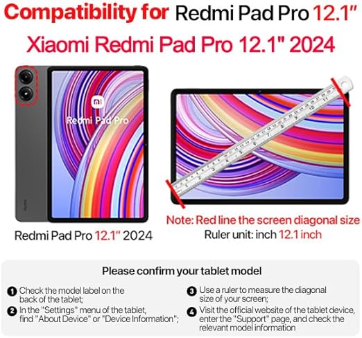 Uyumlu modeller: Redmi Pad Pro 12,1 inç 2024 için özel olarak tasarlanmıştır. Diğer tablet modelleri için uygun değildir. Model numaranızı bulmak için lütfen tabletinizin arka kısmının alt kısmını kontrol edin.