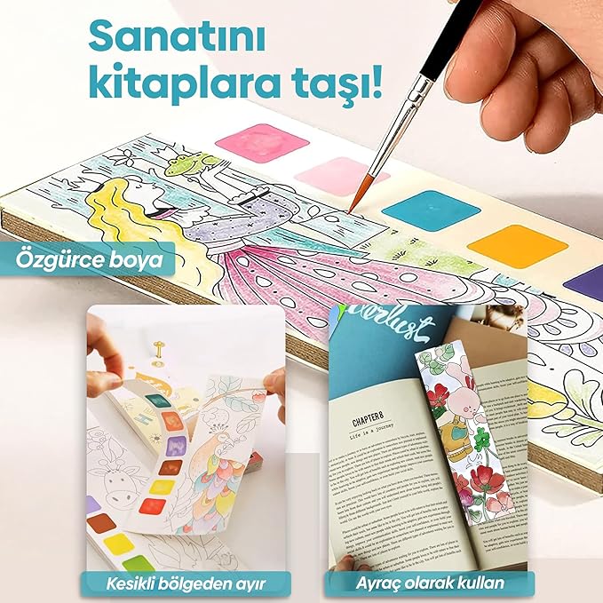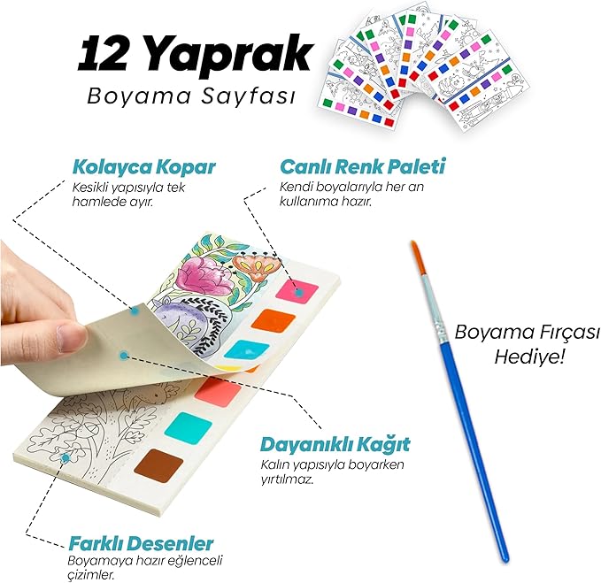 Hazır Renk Paleti ile Pratik Boyama: Her sayfanın kenarında bulunan renk paleti sayesinde ekstra boya kullanmadan boyama yapılabilir. Fırçayı suya batırmak yeterli!