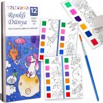 Renk Paletli Sulu Boya Kitabı + Fırça, 12 Sayfa Boyama Kitabı, Aktivite Boyama Seti, Çocuklar için Yeni Nesil Sulu Boya Defteri (Renkli Dünya)