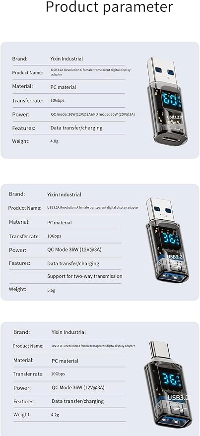 Malzeme: Yüksek kaliteli PC malzeme Transfer Hızı: 10Gbps, yüksek hızda veri transferi için ideal Güç Kapasitesi: o QC Modu: 36W (12V@3A) Özellikler: o Veri transferi ve şarj işlemleri için kullanılabilir.