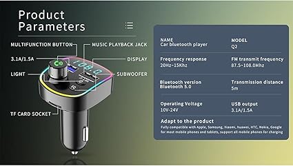 RGB Renkli FM Transmitter MP3 Çalar Bluetooth 5.3 Çakmaklık Hızlı Şarj Aleti (RGB LED Işıklı BT 5.0)