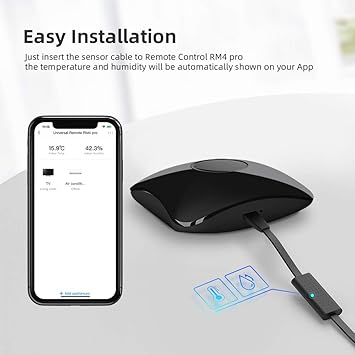 Kullanımı çok kolay: RM4 mini’nizi BroadLink uygulamasında önceden kendi USB kablosuyla yapılandırdıysanız, kabloyu bu HTS2 sensör kablosuyla değiştirmeniz yeterlidir. Uygulama sıcaklık ve nem sayısını otomatik olarak gösterir. RM4 mini’yi ilk kez kurduğunuzda, sensör kablosunu RM4 mini ile güç kaynağı arasına bağlayın ve RM4 mini’yi kurmak için uygulamadaki sihirbazın talimatlarını izleyin.