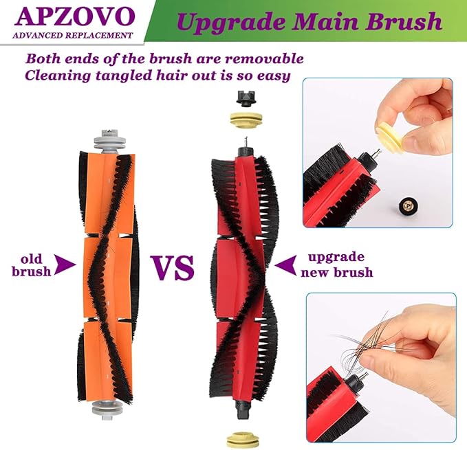 Geliştirilmiş ana fırça ve yan fırça: Çıkarılabilir tasarıma sahip ana fırça sayesinde kullanıcılar fırçanın etrafında dolaşan saçları kolayca temizleyebilir. Yan fırça silikondan yapılmıştır, mobilya veya duvarları iz bırakmadan derinlemesine temizler. Dolaşmayan tasarım, birbirine karışmış kıllardan kaynaklanan tıkanmayı azaltır ve naylon kıllı yan fırçalardan daha uzun süre dayanır.
