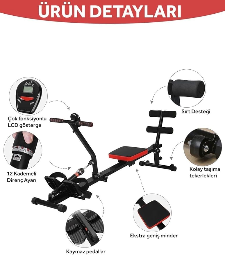 LCD gösterge ile zaman kalori ve kürek sayısı takibi 152 santimetre uzunluk 55 santimetre genişlik 63 santimetre yükseklik ölçüleri 22-29 santimetre arasında 3 kademeli eğim ayarı 11.5 kilogram net ve 12.8 kilogram brüt ağırlık
