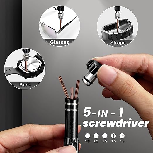 【Beşi bir arada saat tornavidası】Beş çeşit tornavida ucu birçok durum için uygundur: Saat pili sabitleme vidaları, saat gövdesi vidaları, saat kayışı vidaları ve gözlük vidaları için de kullanılabilir. Tornavidanın ucundaki kapak açılabilir ve diğer tornavida uçlarını saklamak için içi boştur.