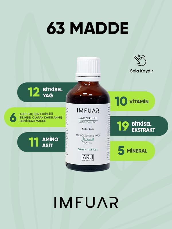 Imfuar saç serumu Kadın ve Erkek için aynı formüldür. İçerisinde”63” tane aktifleştirilmiş hammadde bulunur. %5 Procapil ve sawpalmettonunyanında 10 Tane Vitamin, 19 Tane Bitki Ekstraktı, 12 Tane Bitki Yağ, 5 Tane Mineral, 11 Tane Amino Asit, 6 Tane Saç için etkinkiğibilimsel olarak kanıtlanmış Sertifikalı Madde bulunmaktadır.
