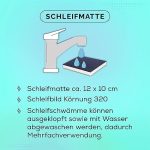 Ahşap yüzeyin hazırlanması için bir zımpara matı yakl. 12×10 cm zımpara resmi 320 tanecikli, ince kesim – 1 adet