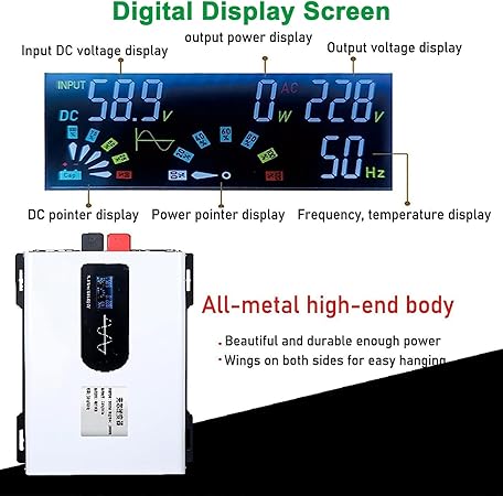【LCD Ekran】 LCD ekran gerçek zamanlı kullanım durumunu (çalışma sıcaklığı, akü durumu, çıkış voltajı, giriş voltajı, kullanılan cihaz gücü ve dönüştürücü koruma nedenleri gibi) görüntüleyebilir ve kullanımı takip etmeyi kolaylaştırır. Acil durumlar, kasırgalar, fırtınalar ve elektrik kesintileri ile başa çıkmak için evde veya dışarıda cihaza güç sağlamak için 12V / 24V / 48V / 60V / 72V pil sistemini takmanız yeterlidir, karavan, tekne gezintisi, kamp çalışmaları için uygundur.