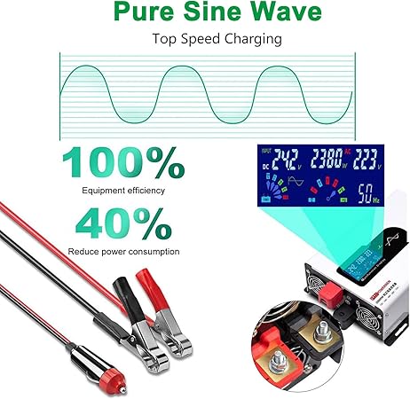 【Parazit Önleyici Saf Sinüs Dalga İnvertörü】 Araç invertör dönüştürücü, düşük parazit, düşük gürültü ve büyük yük kapasitesine sahip saf sinüs dalga teknolojisini benimser, 12V / 24V / 48V / 60V / 72V DC’yi 220V / 230V / 240V AC’ye dönüştüren bir voltaj dönüştürücüdür. Acil durumlarda, kamplarda, arabalarda, evlerde, karavanlarda ve güneş enerjisinde kullanılabilir.