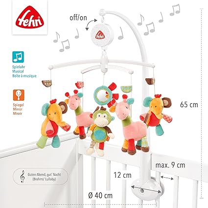 TESLİMAT KAPSAMI – 1 x müzikli mobil Safari / Rahatlatıcı “Brahm’ın Ninnisi” melodili ve sevimli figürlü mobil / Ø 40 cm / Malzeme: yumuşak kadife, kumaş / 30°C’de yıkanabilir / Ürün no.: 074291