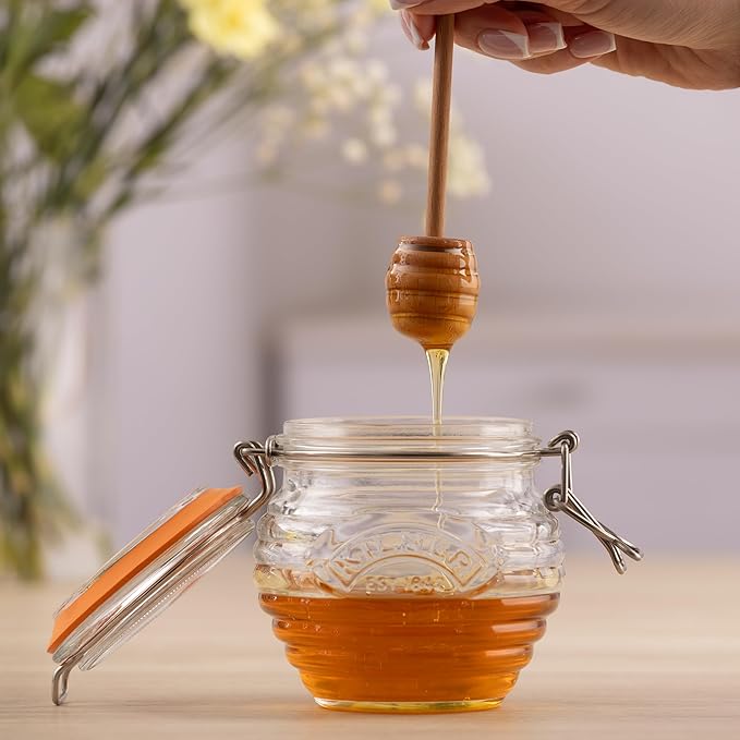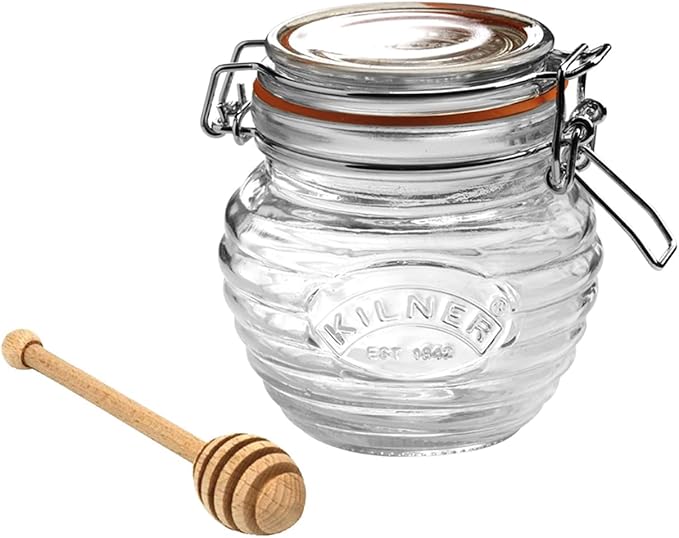 BAL SAKSI | Ahşap Kepçeli Kilner Nervürlü Cam Bal Tenceresi, bal, şurup veya pekmezi şık bir şekilde saklamak ve servis etmek için mükemmeldir. Kayın ağacı kepçesi, bal veya şurubu verimli bir şekilde toplamak için geniş oluklara sahiptir ve tahıllar, tost veya tatlılar üzerinde sorunsuz bir şekilde gezdirilmesine olanak tanır.