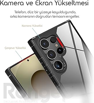 Yükseltilmiş Kenarlar: Yükseltilmiş ekran ve kamera kenarları, cihazınızı düz yüzeye koyduğunuzda ekranı ve arka kamerayı doğrudan temasla oluşabilecek çizilmelere ve hasara karşı korur. S25 ultra şeffaf kılıf, cihazınıza tam koruma sağlayarak uzun ömürlü kullanım sunar.