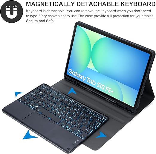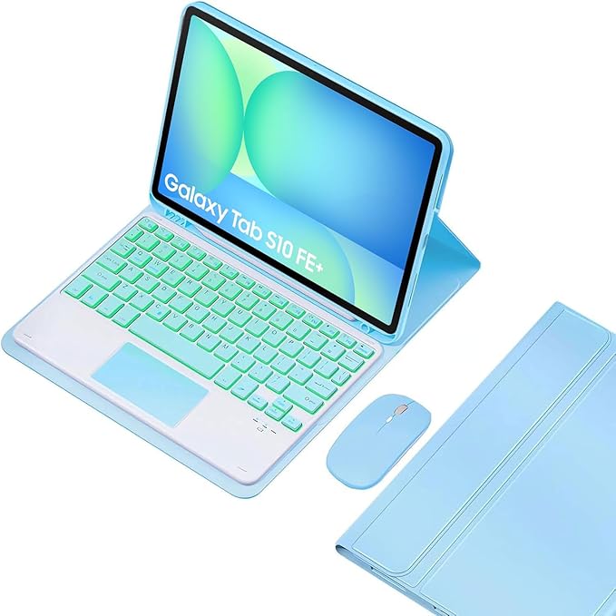 Samsung Galaxy Tab S10 FE+ Plus 13,1 inç 2025 Model (SM-X620/X626), 7 Renkli Aydınlatma, Çıkarılabilir Bluetooth Almanca QWERTZ Klavye, Kalem Tutucu ve Fareli, Mavi