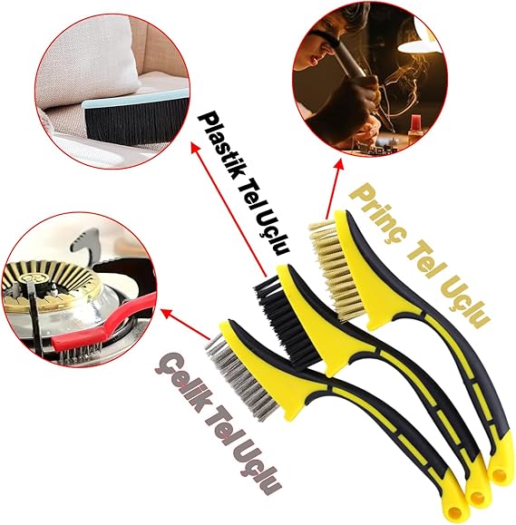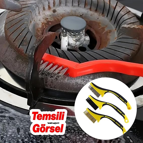 Saplı Metal Çok Amaçlı Temizleme Fırçası 3’lü Set Tel Fırça Kir Pas Kireç Mangal Izgara