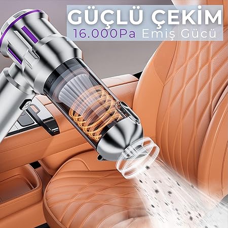 16000 Pa Yüksek Emiş Gücü: Bu mini kablosuz süpürge, 16000 Pascal’a kadar güçlü vakum performansı sunarak aracınızdaki inatçı toz ve kırıntıları etkili şekilde temizler