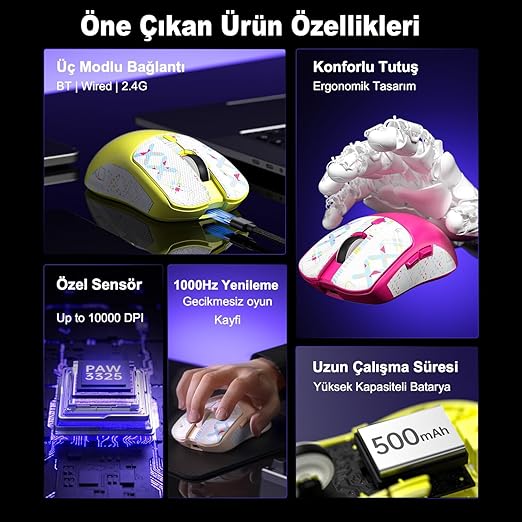 Uzun Süreli Batarya ve Dayanıklılık 500mAh batarya kapasitesi ile 10-14 gün kullanım süresi (günde 5 saat) sunan gaming mouse, USB-C ile hızlı şarj imkanı sağlar. 10 milyon tıklama dayanıklılığı ile uzun ömürlü kullanım garantisi verir.