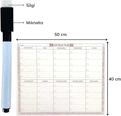 Manyetik Yapışkanlı Sticker Haftalık Program Planlayıcı 47,50×47,50 cm Manyetik Duvar Planlayıcı, haftalık iş planınızı oluşturabileceğiniz ve duvara yapıştırılabilir organizer takvimdir.
