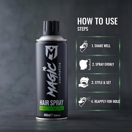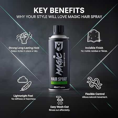 Magic Cosmetics saç spreyi, dayanıklılık ve kalıcılık sağlamak için formüle edilmiştir, böylece saç modeliniz zorlu hava koşullarında bile bozulmadan kalır.