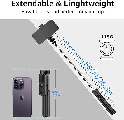 【3’ü 1 Arada Çok Fonksiyonlu Tasarım】 Bu hafif 3’ü 1 arada Bluetooth selfie çubuğudur. İki şekilde kullanılabilir, elinizde tutabilir veya tripodu açıp fotoğraf çekmek için masaya veya yere yerleştirebilirsiniz, böylece farklı açıları kolayca seçebilirsiniz. Bluetooth uzaktan kumanda, başkalarından fotoğraf çekmelerini istemenize gerek yok!