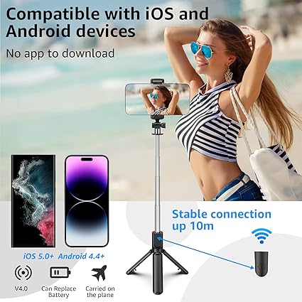【Süper Uyumluluk】 Selfie çubuğu telefon tutucumuz çoğu akıllı telefona uyar. Bluetooth sürüm 4.0. Şunlarla uyumludur: iPhone 14/14pro max/iPhone 13/13 Pro/13 Pro Max/12 Pro Max/12 Pro/11/XS MAX/XR/XS/X/8/7/6, Samsung Galaxy S10/S9/S8/S7/S6/Note ve Go Pro.