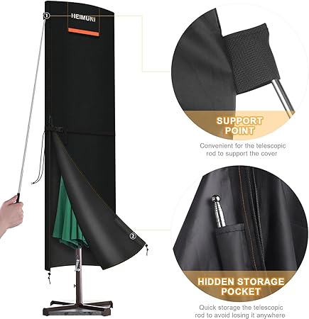 KULLANIMI KOLAY: Bu bahçe şemsiyesi kılıfı, yan tarafında 2 metre uzunluğunda su geçirmez bir fermuara ve 1,2 metre uzunluğunda teleskopik çubuğa sahiptir, bu nedenle bir kişinin kullanması kolaydır. Şemsiye koruyucu kapağın kapağın ortasında bir kemer ve toka bulunur, böylece şemsiyenin boyutuna göre sıkılığı ayarlayabilirsiniz, böylece şemsiyeye daha iyi oturmasını sağlar