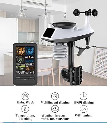 【Multifunction Weather Station】The weather stations color screen displays a wealth of weather information including rainfall data, wind speed and direction, indoor and outdoor temperature and humidity, barometric pressure index, date and time, etc., and you can rely on its accuracy to make appropriate plans.