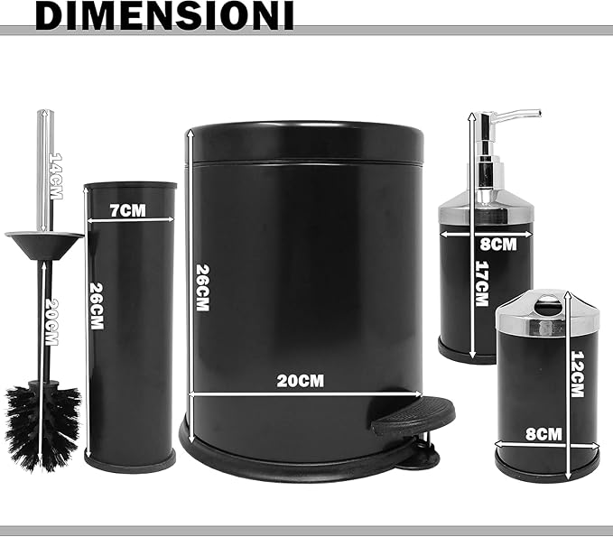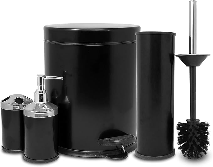 Serisi Ayak Basmalı Özellikli 4′ Lü Banyo Seti Çöp Kovası+Kolozet Fırçası+Sıvı Sabunluk+Fırçalık Paslanmaz Siyah