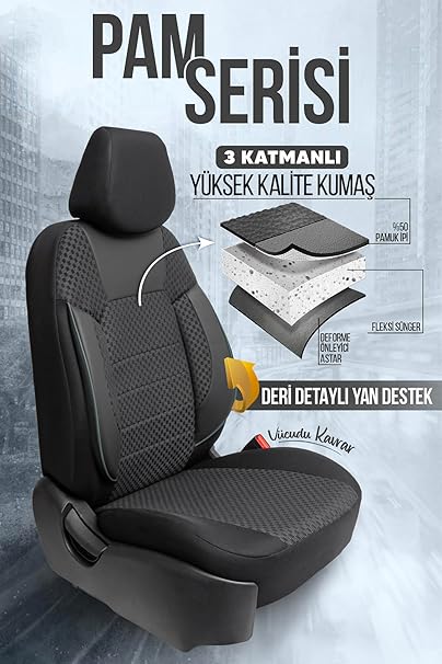 PAM Serisi Universal Oto Koltuk Kılıfı Tam Set Paket İçeriği: 2x ön yaslanma, 2x ön oturma, 1x arka yaslanma, 1x arka oturma, 1x kanca paketi