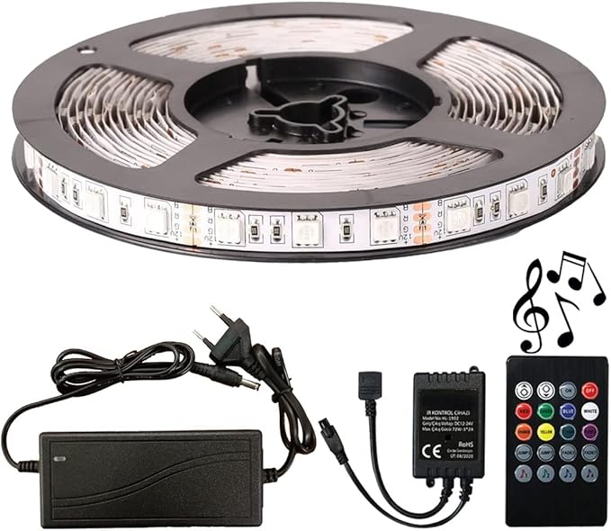 Şerit Led Tak Çalıştır Sese ve Müziğe Duyarlı Kumanda 5050 3 Çipli iç Mekan Silikonsuz… (10 Metre)